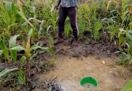 Pichani juu: mkulima akiangalia baadhi ya panya waliokufa kwa kushindwa kutoka kwenye ndoo yenye maji, baada ya kutumbukia wakitafuta maji Panya waliokuwa wanaendelea kubungua mahindi na kuharibu m...