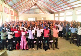 Pichani Juu: wasimamizi wa vituo wakitoa kiapo cha kutunza siri katika ukumbi wa mikutano wa shule ya sekondari Kiburubutu