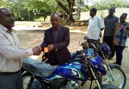Pichani juu: Kaimu Mkurugenzi, mwanasheria Faraja Nakua akipokea moja ya funguo za pikipiki ambazo zinatarajiwa kutumika katika mradi wa kunusuru zao la mpunga katika Halmashauri ya wilaya ya Kilomber...